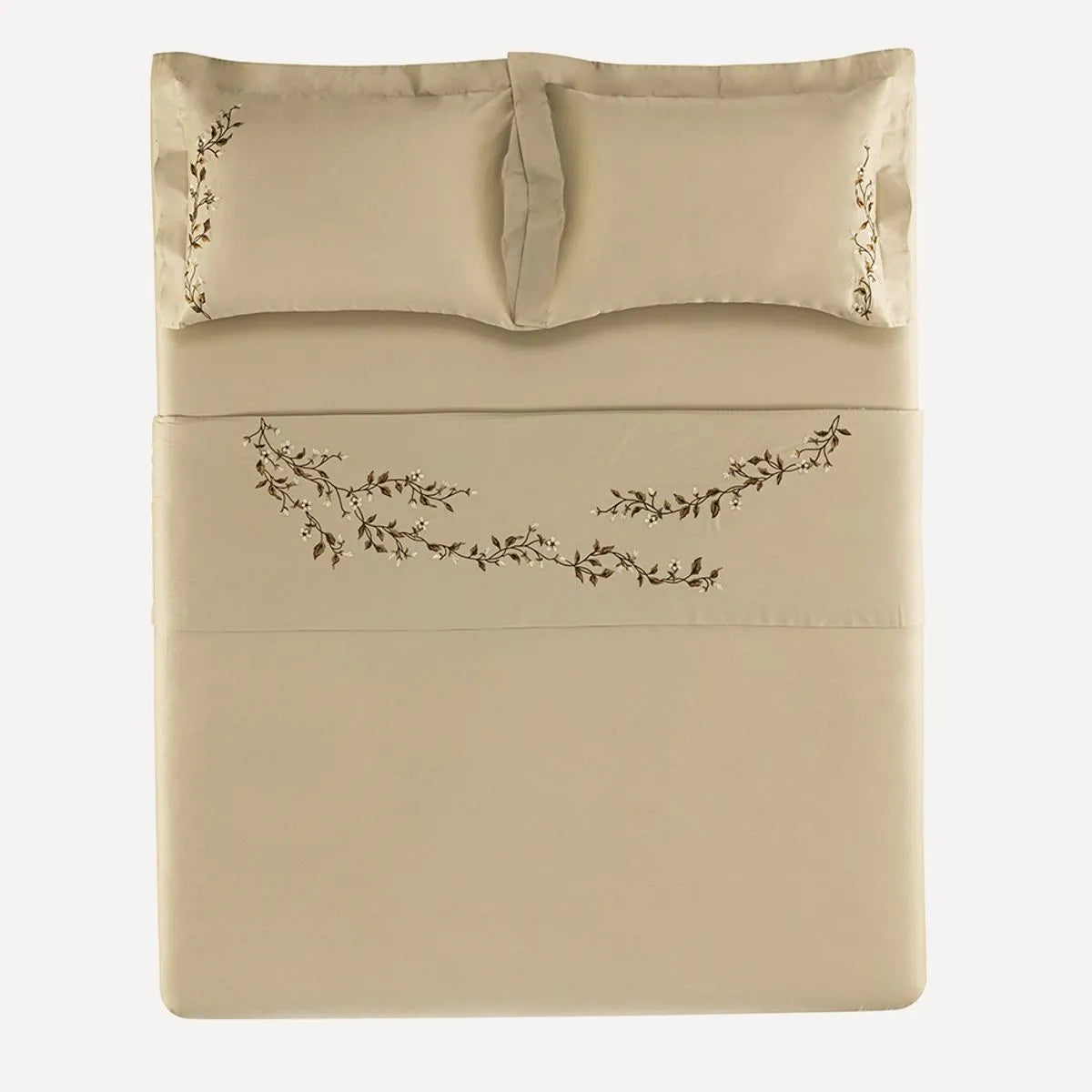 Con bordados florales en las fundas de almohada y el dobladillo de la sábana encimera, el juego de cama Carmela aporta un toque delicado al dormitorio y crea un ambiente natural. Los tonos tierra y naturales refuerzan la sensación de confort y calidez, mientras que la tela de algodón egipcio hipoalergénico de 300 hilos proporciona suavidad y un tacto excelente. Es la opción ideal para quienes valoran la delicadeza de los detalles y buscan un dormitorio neutro pero distintivo.