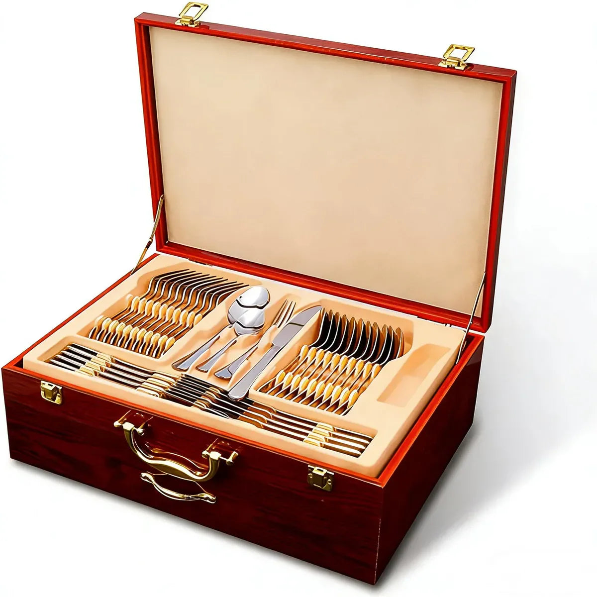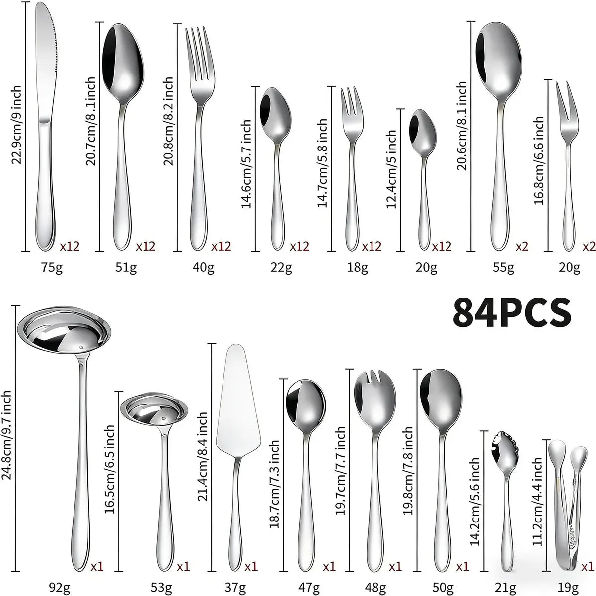 Juego de cubiertos para 12 personas: 12 cuchillos, 12 cucharas, 12 tenedores, 12 cucharadas, 12 tenedores para pastel, 12 cucharillas (84 piezas en total), 2 cucharas para verduras, 2 tenedores para carne, 1 cuchara sopera, 1 cuchara para salsa, 1 pinza para azúcar, 1 cuchara para azúcar, 1 cuchara para ensalada, 1 tenedor para ensalada, 1 espátula para pastel, 1 cuchara para mantequilla.