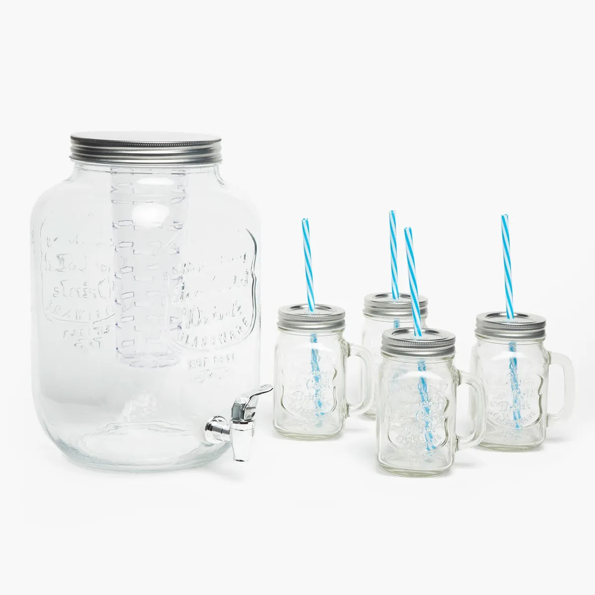 Set Dispensador Agua Mica 8 Litros con 4 Vasos Mason Jars