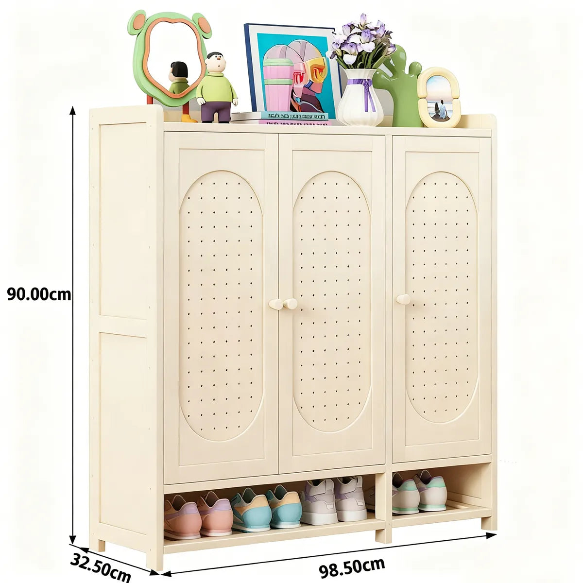 Mantén tu entrada, dormitorio o sala siempre ordenados con este zapatero de bambú de diseño moderno y acabado en color blanco crema. Su estructura de 3 puertas y 7 niveles ofrece una solución amplia y funcional para organizar tu calzado sin perder elegancia.